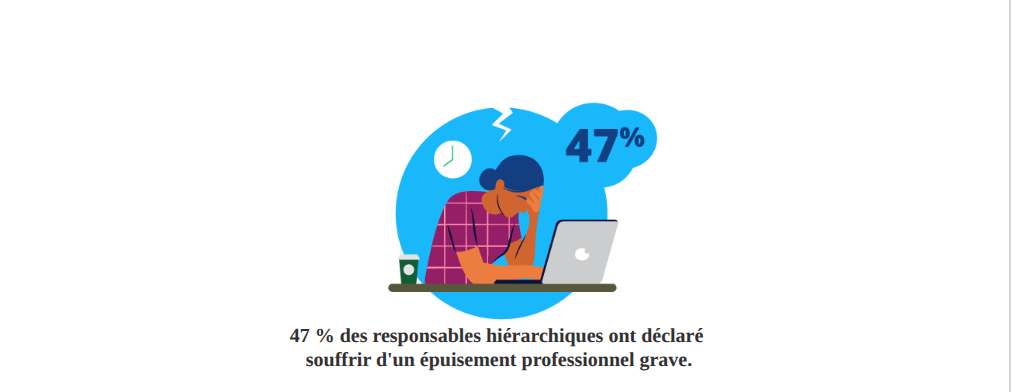 Aucun groupe n'a ressenti la pression plus vivement que les responsables d'équipe. Près de 47 % d'entre eux ont déclaré souffrir d'un épuisement professionnel grave, un chiffre qui devrait donner à réfléchir à toute organisation. On demande à ces responsables de favoriser le bien-être, de stimuler les performances, de gérer le changement, d'encadrer les équipes et d'adopter de nouvelles technologies, souvent sans bénéficier du soutien ou de la formation nécessaires pour le faire de manière durable.