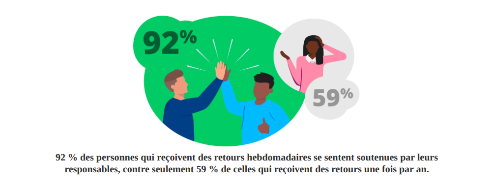 Les données étaient frappantes : les équipes qui s'appuyaient sur des points hebdomadaires ou des débriefings rapides se sentaient nettement plus soutenues. 92 % des employés recevant fréquemment des commentaires informels estimaient que leurs dirigeants les soutenaient, contre seulement 59 % de ceux qui ne recevaient que des évaluations annuelles ou semestrielles.