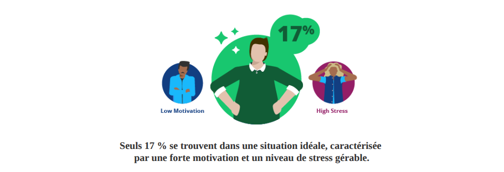 Seuls 17 % des travailleurs se trouvaient dans la « zone idéale », où la motivation était élevée et le stress gérable. La plupart des employés se trouvaient à l'une ou l'autre extrémité : épuisés, démotivés ou poussés à des limites insoutenables.